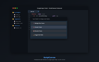 ScriptCanvas เป็นส่วนเสริมของ Chrome ที่ออกแบบมาเพื่อยกระดับ Google Apps Script IDE ด้วยธีมมืดที่เป็นมืออาชีพและการมองเห็นโฟลเดอร์ที่ดีขึ้น ผู้ใช้สามารถเลือกจากสามธีมที่โดดเด่น—Midnight Blue, Dracula และ Monokai—แต่ละธีมมีเป้าหมายเพื่อลดความเมื่อยล้าของดวงตาในระหว่างการเขียนโค้ดที่ยาวนาน ส่วนเสริมนี้ให้ความสำคัญกับความสะดวกสบายของผู้ใช้ในขณะที่ยังคงรักษาสภาพแวดล้อมการเขียนโค้ดที่ดึงดูดสายตา